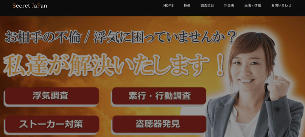浮気調査に特に力を入れており、サイトには「不倫・浮気慰謝料チェッカー」などもあるので、浮気で悩んでいる人はぜひ一度チェック。
