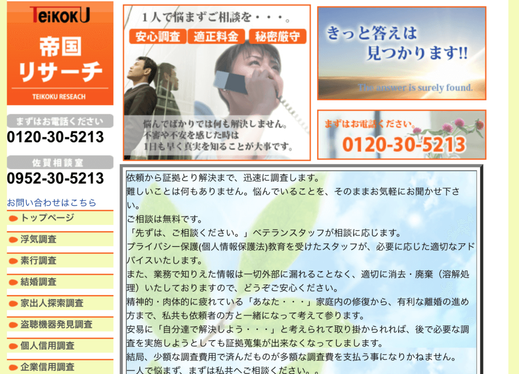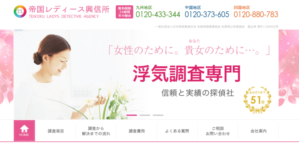 帝国レディース興信所は、佐賀市に拠点を構える探偵事務所です。女性スタッフが多数在籍しているので、女性でも気兼ねなく安心して相談できます。